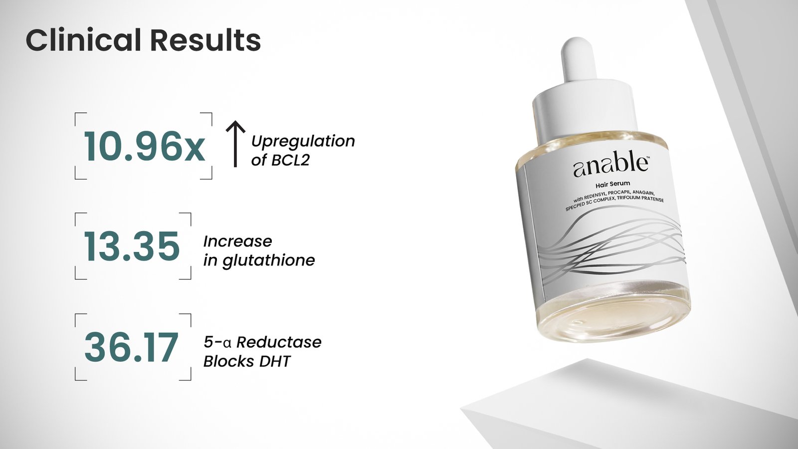 Anable Serum utilizes pharmaceutical-grade active ingredients. In fact, it has taken years of clinical research and work by dermatological experts to develop with every ingredient selected specifically because of one very important factor: the ingredient’s proven efficacy and safety in supporting scalp health, re-activating hair follicles and improving hair vitality.